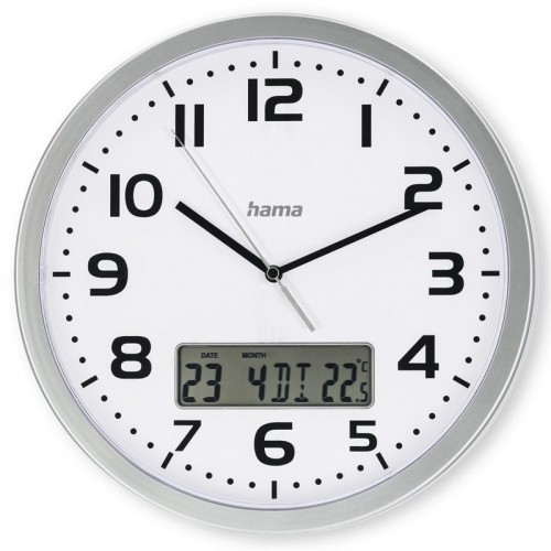 Hama Moorea, nástěnné hodiny řízené rádiovým signálem, s datem a teplotou, průměr 30 cm, stříbrné