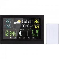 Tato meteostanice nabízí barevný VA displej s dotykovým ovládáním o velikosti 168 × 93 mm, který zajišťuje vynikající čitelnost a intuitivní ovládání. Díky možnosti trvalého podsvícení je zobrazení přehledné i ve tmě. Displej poskytuje širokou škálu informací, včetně aktuální teploty (vnitřní od -10 °C do +50 °C, venkovní od -50 °C do +70 °C), relativní vlhkosti (1 % až 99 % RH), atmosférického tlaku a předpovědi počasí. Kromě toho zobrazuje fáze Měsíce, kalendář, datum a hodiny řízené DCF signálem, což zajišťuje vždy přesný čas. Stanice umožňuje záznam minimálních a maximálních hodnot, nastavení teplotní výstrahy, výběr jednotek teploty (°C/°F) a dokonce korekci nadmořské výšky pro přesnější měření tlaku. Je vybavena funkcí budíku s možností opakovaného buzení, což z ní činí praktického pomocníka nejen pro sledování počasí, ale i pro každodenní použití. Bezdrátové čidlo s dosahem až 100 m (součástí balení) umožňuje přesné měření venkovních podmínek a je možné připojit až tři čidla současně. Napájení hlavní jednotky je možné buď adaptérem (5 V DC/300 mA), nebo třemi AAA bateriemi, zatímco čidlo využívá dvě AAA baterie. Díky kompaktním rozměrům hlavní jednotky (17 × 192 × 127 mm) a elegantnímu černému provedení se hodí do jakéhokoli interiéru a poskytuje moderní a stylový doplněk domácnosti.