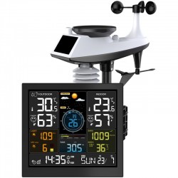 Tato profesionální meteostanice s velkým 24,4cm displejem nabízí WiFi připojení a propojení s aplikací Tuya/Smart Life pro zobrazení aktuálních hodnot a statistik. Měří vnitřní (-20 °C až 50 °C) a venkovní teplotu (-40 °C až 70 °C), vlhkost (20 % až 95 %), rychlost větru (0 až 180 km/h), směr větru (0–359°), srážky (0 až 9999 mm), atmosférický tlak (600–1100 hPa), intenzitu světla (0–128 klux) a UV index (0–15). Nabízí automatickou synchronizaci času, zobrazení dne v týdnu v 15 jazycích, dva denní budíky se snooze funkcí (5–60 min nebo vypnuto) a kalendář do roku 2099. Předpověď počasí na 12 hodin využívá tlak vzduchu a zobrazuje ikony jako slunečno, oblačno, déšť nebo sněžení. Bezdrátové senzory s dosahem až 100 m umožňují připojení 1× multi-combination senzoru a až 3 teplotních/vlhkostních senzorů. Napájení DC 5V / 1A adaptér + záložní 2× AA baterie, senzory na AAA baterie. Díky propojení s aplikací, široké škále měření a preciznímu zpracování je ideální volbou pro všechny, kdo chtějí mít meteorologická data vždy po ruce.