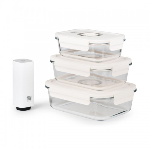 Kompletní set – vakuovací pumpa a dózy s objemem 630, 1 040 a 1 480 ml, borosilikátové sklo, víko z BPA Free plastu s nastavitelným ukazatelem data.